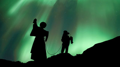 ved hjelp av silhuetter mot nattehimmelen og nordlyset.